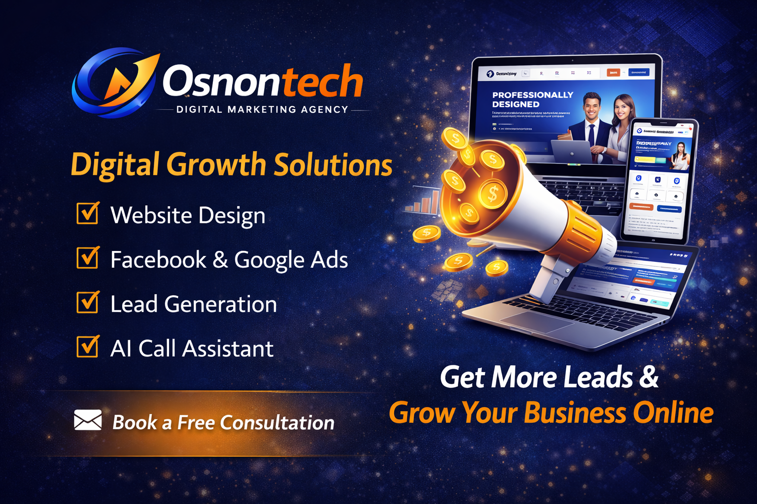 Osnontech is a digital marketing agency helping businesses grow through website design, targeted advertising, lead generation systems, and AI-powered automation.